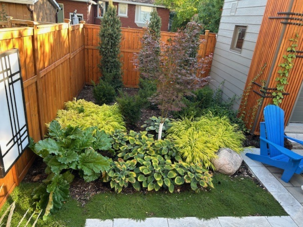 With a large maple at the back of their space, shade plants thrive. But the most notable addition is a large, Italian sculpture.