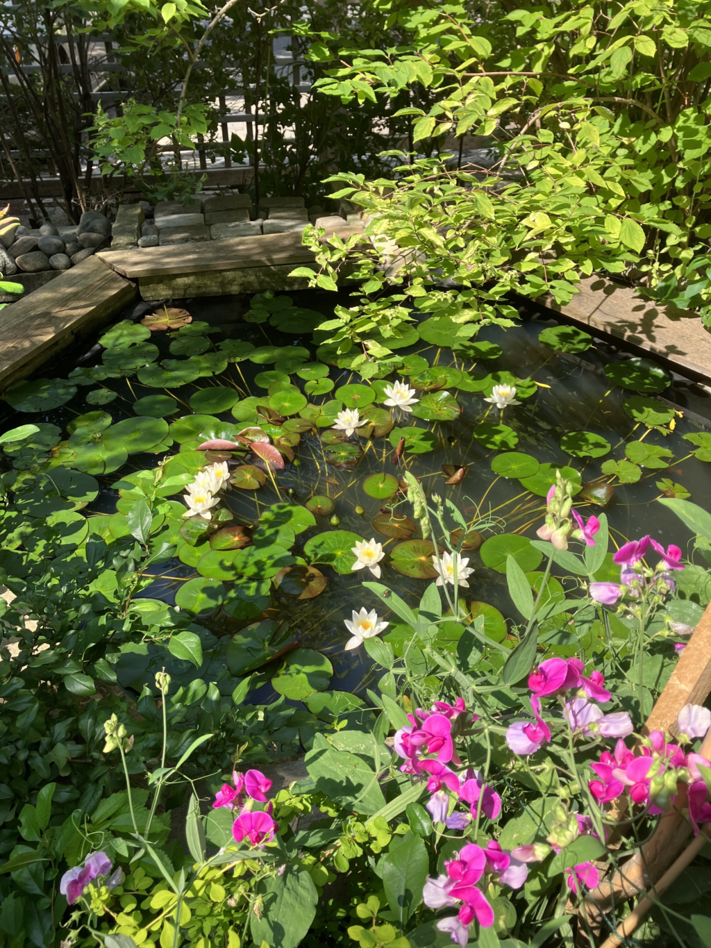 The Brandon’s garden has been influenced by visits to Europe and Japan and features a small pond with water lilies.